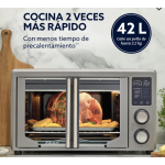 Cocinar en casa se vuelve más práctico con un horno versátil, moderno y fácil de limpiar. El Horno Digital con Freidora de Aire Oster de 42 L tiene un panel digital intuitivo que facilita el control, y un interior antiadherente que evita que los alimentos se peguen, haciendo la limpieza mucho más sencilla. Ofrece 9 maneras de cocinar: freír al aire, hornear, asar, tostar, convección, más 4 programas automáticos para freír al aire papas fritas, pescado, bocadillos y alitas de pollo, en un solo horno práctico para cualquier comida. Su capacidad para hasta 6 rebanadas de pan o un pollo entero de hasta 2,2 kg permite preparar recetas deliciosas. Cocina 2 veces más rápido*** gracias a su menor tiempo de precalentamiento, perfecto para tener todo listo sin esperar tanto. La función Freír al Aire logra una textura crujiente con 99.5% menos aceite****, una manera más saludable de disfrutar las comidas. Cuenta con luz interior para supervisar fácilmente los alimentos, y puertas estilo francés que permiten un acceso cómodo sin ocupar espacio extra en la cocina. Incluye 1 rejilla para hornear, 1 bandeja para migas, 1 bandeja de malla para freír al aire y 1 bandeja para hornear con recubrimiento Oster DiamondForce, que no se agrieta, pela, astilla o descascara* y es 15 veces más fácil de limpiar**.