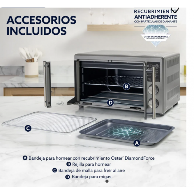 ACCESORIOS INCLUIDOS: 1 rejilla para hornear, 1 bandeja para migas, 1 bandeja de malla para freír al aire y 1 bandeja para hornear con recubrimiento Oster DiamondForce